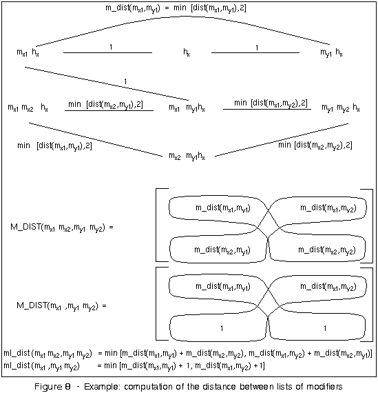 The conceptual distance between modifiers is computed by taking the minimum value of either the single term distance value between the modifiers, according to the measure in Definition 2, or a distance value of `2', according to the assumption that a modifier specializes a head noun. As illustrated in Figure 8, a maximum distance of `2' between the lists mx1 hx and my1 hx is obtained by considering that my1 hx is an specialization of hx and that hx is a generalization of mx1 hx. For instance,